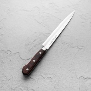 Філейний японський ніж Suncraft Senzo Clad, лезо 240 мм з тришарової сталі (Aus-10, твердість 59–60 HRC), ручка з Pakka Wood, загальна довжина 370 мм. Можлива лазерна гравіровка. Виготовлено в Японії.