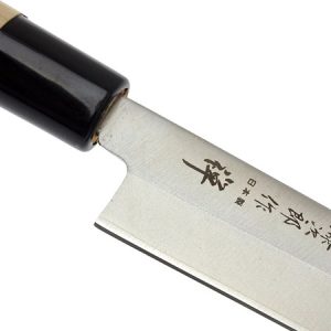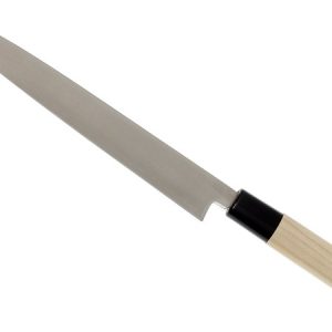 - Традиційний сашими з одностороннім заточуванням – ніж для нарізки сирого рибного філе тонкими скибочками та приготування суші. Тонке і вузьке лезо розрізає рибу на найтонші скибочки одним довгим надрізом до себе. За формою чимось нагадує європейський філейний ніж. Ніж для сашими заточений з одного боку і має ширше лезо.